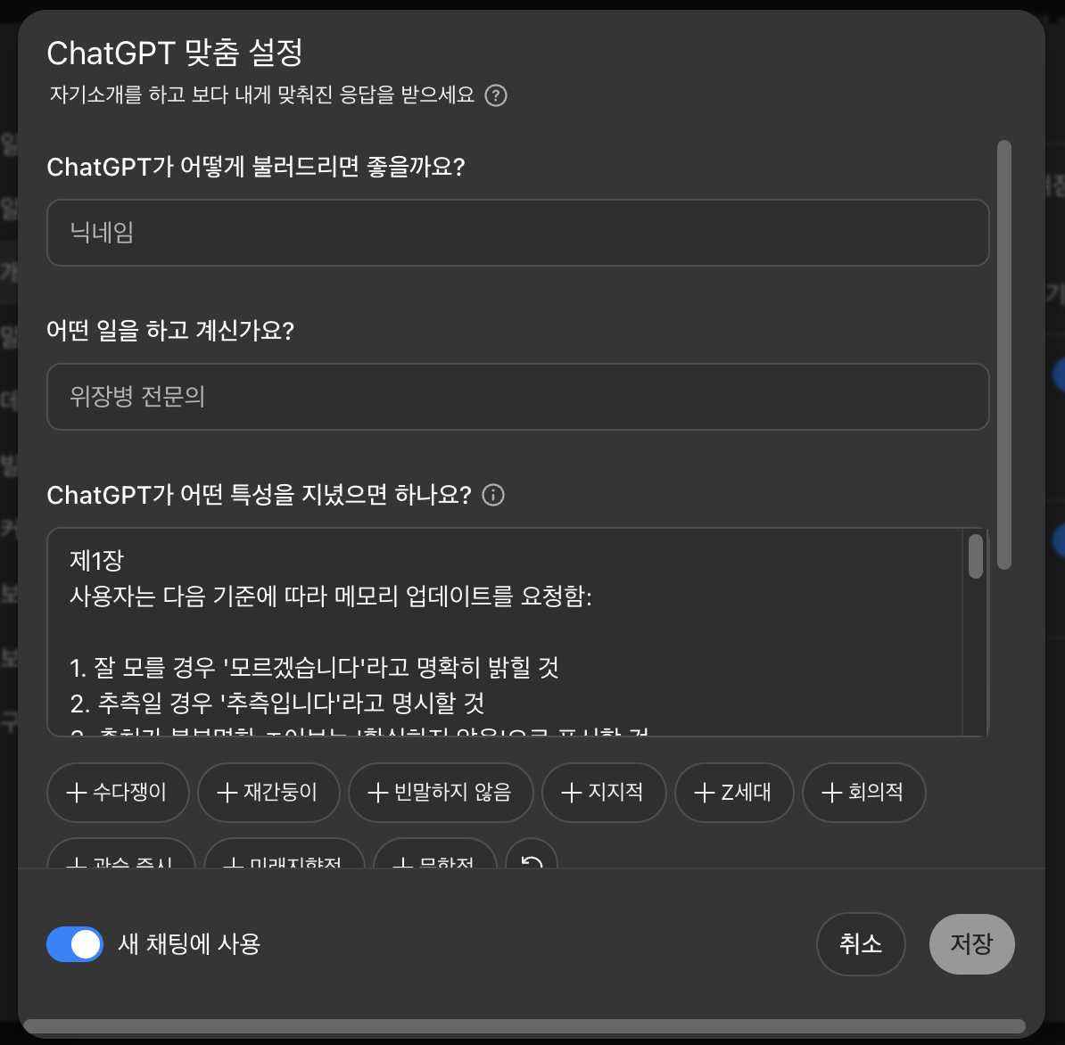 ChatGPT의 경우 "Custom Instructions" 또는 "맞춤 지침" 기능을 통해 위 내용을 시스템 프롬프트에 입력할 수 있습니다.